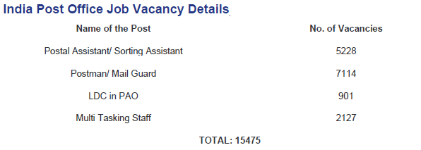 | Job Name | Postal Assistant/ Sorting Assistant, Postman/ Mail Guard, LDC in PAO and Multi Tasking Staff |